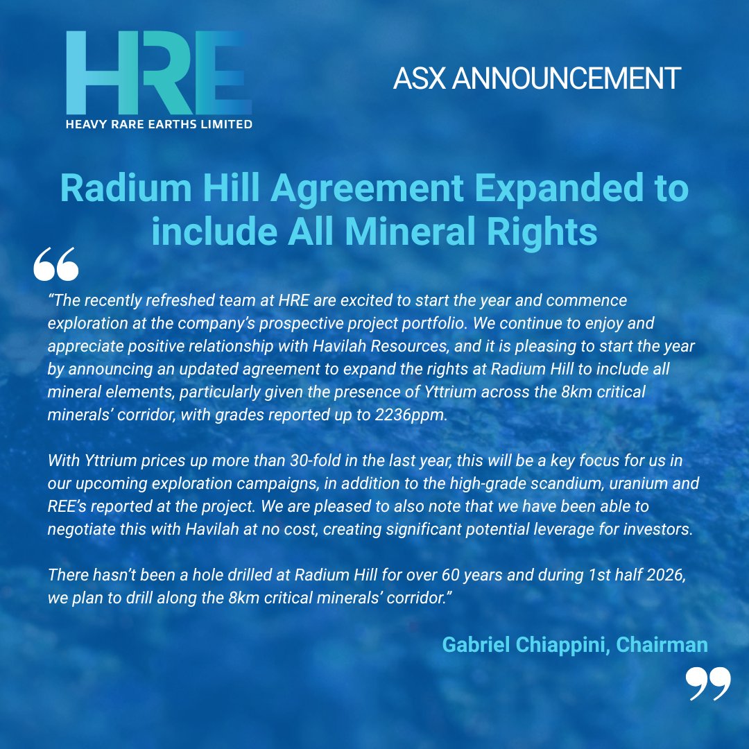 $HRE updates its agreement with Havilah Resources (ASX:HAV), expanding the Radium Hill Project, South Australia, to an All Minerals focus, including critical minerals, plus precious & base metals.